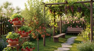 Strawberries in pots, dwarf apple trees, or grapevines can all thrive in home gardens.
