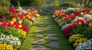 Plant seasonal flowers like tulips, roses, or zinnias to create vibrant edges around your lawn or pathways. Mixing perennials with annuals ensures color throughout the year.