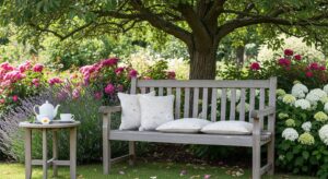 Every home garden needs a spot to relax. Create a seating nook with a wooden bench, swing chair, or bistro set surrounded by greenery.