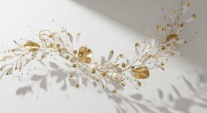 Ivory florals, gold ornaments, and metallic sprays for luxury minimalism.
