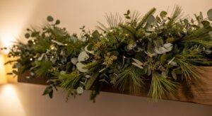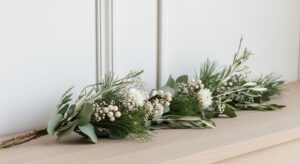 Chunky natural greenery with warm whites and wood.