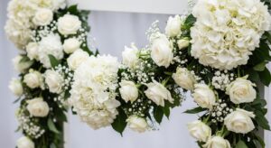 Hydrangeas, roses, and ranunculus in crisp white tones.