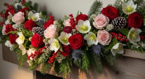 Roses, peonies, and winter florals for a romantic look.