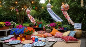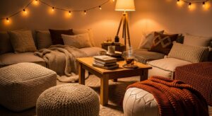 Set up a relaxed seating area with low coffee tables, poufs, and plenty of cushions. Add a soft throw blanket for cool evenings and make it your go-to spot for late-night chats.