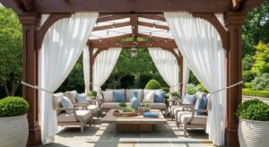 Keep your guests cool and comfortable with shade options like pergolas, umbrellas, or retractable awnings. Draping outdoor curtains can also add a touch of elegance and privacy.