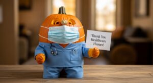End your display with a heartfelt tribute. Paint your pumpkin in blue or green scrubs, add a face mask, and attach a small thank-you note that says, “To all healthcare heroes, thank you for your compassion.”