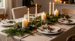 For your holiday table, think understated elegance. Use a plain linen tablecloth, a few candles, and a simple centerpiece of greenery or pinecones.