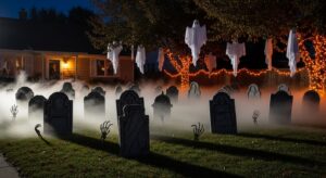 Your yard can become the centerpiece of your spooky setup. Foam tombstones, skeletal hands rising from the ground, and a fog machine create an instant graveyard feel.