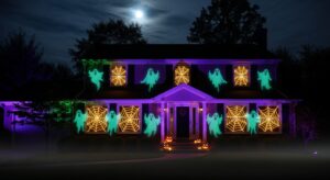 Projector lights with moving ghosts, bats, or spider patterns create a playful atmosphere indoors or outdoors.
