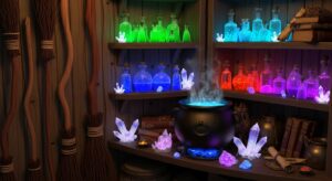 Decorate shelves with crystals, candles, and spell books for a magical aesthetic.