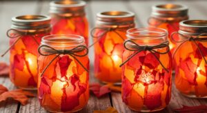 Transform mason jars into cozy candle holders by coating them with Mod Podge and tissue paper in fall colors. Add twine bows and place a tea light inside for a soft autumn glow.