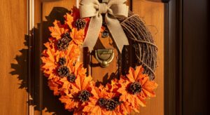 Make a welcoming wreath for your front door using faux leaves, pinecones, acorns, and a burlap bow. You can even add a small wooden sign that says “Give Thanks” or “Welcome Fall.”