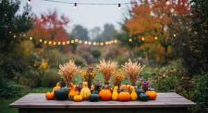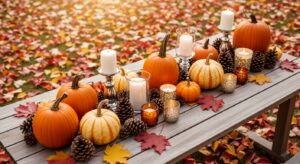 Set the tone with nature-inspired centerpieces. Use pumpkins, pinecones, acorns, and dried leaves arranged in a wooden tray or woven basket. Add a few candles or lanterns to enhance the evening glow.