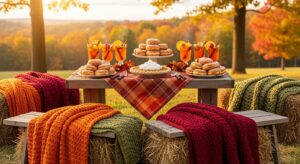 Finish your outdoor setup with a cozy drink station featuring apple cider, hot chocolate, or mulled wine. For dessert, serve pumpkin pie or apple crumble with warm blankets ready for guests to snuggle in.