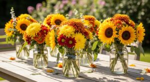 Use wildflowers or fall blooms like chrysanthemums, sunflowers, and dahlias in mason jars or rustic vases. Their colors and textures perfectly capture the essence of autumn in the garden.