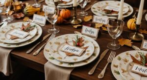Choose plates and glassware that reflect the colors of fall — amber, rust, cream, or deep green. Add cloth napkins tied with twine and a sprig of rosemary for a simple, fragrant detail.