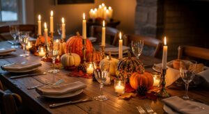 Candlelight instantly elevates your table décor. Use a combination of tall taper candles, short votives, and tea lights in various holders for depth. Pair them with small pumpkins or greenery for an elegant touch.