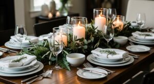 If you love a clean look, go for minimalist décor with neutral colors, glass candleholders, and fresh greenery. This modern approach keeps the focus on the meal and the company while still feeling warm and inviting.