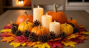 Bring nature indoors with centerpieces made of pumpkins, pinecones, branches, and fall leaves. Mix real and faux elements for longevity, and add a few candles to create a cozy glow that draws everyone together.