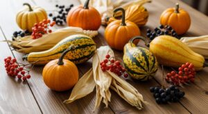 Add small harvest details throughout your table — tiny gourds, dried corn, or clusters of berries. These accents create visual interest and tie the fall theme together beautifully.