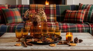 Complete your Thanksgiving tablescape with seasonal flair. Think plaid throws draped over chairs, cinnamon sticks tied with ribbon, or amber-colored glassware for a hint of vintage charm.