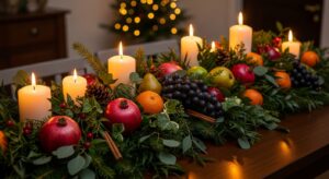You can also create a charming centerpiece with seasonal produce—think pears, gourds, and apples arranged in a wooden bowl or woven basket. This not only celebrates the harvest season but also adds an organic warmth to your table.