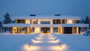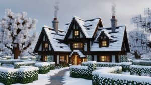 For players who love luxury builds, a modern mansion with snowy landscaping, floor-to-ceiling windows, and glowing white lights creates a dramatic winter look.