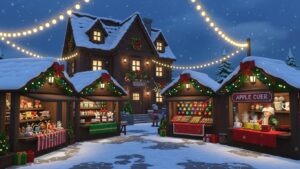 Turn your house exterior into a mini Christmas market setup—wooden stalls, hot cocoa stands, string lights, and holiday décor everywhere.