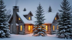 If you want a warm, rustic winter aesthetic, a log cabin is perfect. Use wooden textures, stone fireplaces, and warm lighting. Add snowy pine trees and lanterns outside for a woodland vibe.