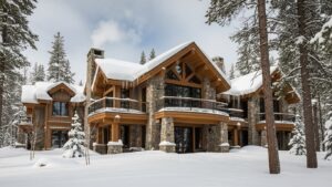 Create a winter sports-themed home with stone walls, a large fireplace, balconies, and snowy pine trees.