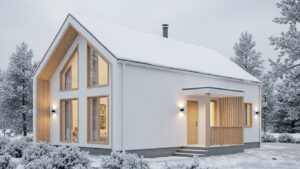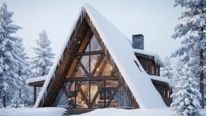 A-frame homes look great in snowy settings. Use large triangular windows, wood beams, and warm lights for a modern lodge-style feel.