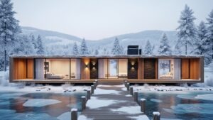 Built on the water with frozen lakes, a dock, soft snow, and large windows overlooking the landscape.