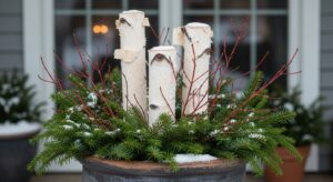 Use tall birch logs as the anchor, surrounded by evergreen boughs and red dogwood twigs.