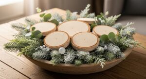 A low bowl filled with birch disks and frosty greens looks elegant and simple.