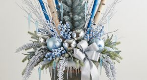 Cool-toned ornaments and frosted stems create a winter wonderland.