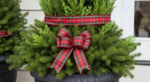 Wrap plaid ribbon around evergreens for a cozy, classic Christmas feel.