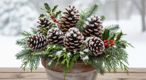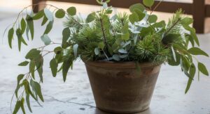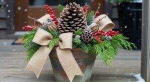Fill your pot with pinecones, burlap ribbon, and fresh fir branches for a touch of farmhouse charm.