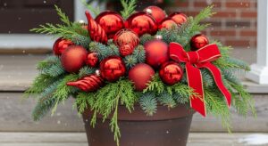 Fill your planter with shiny red ornaments mixed with cedar boughs.