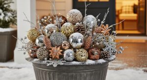 Silver ornaments and sparkly stems bring winter glamour to your porch.