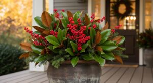 Glossy magnolia leaves and bright red berries add warmth and elegance to any entryway.