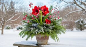Use fresh winter florals like amaryllis mixed with greenery for holiday flair.