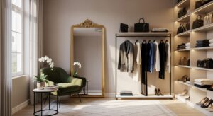 Turn part of your bedroom or spare room into a stylish walk-in closet. Include a vanity mirror, plush seating, and a statement chandelier for glam vibes.