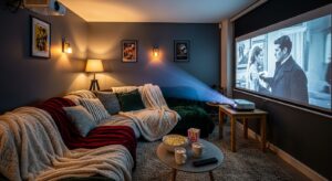 Set up a cozy corner with a small sofa, fuzzy blankets, and a projector or TV screen. Add string lights for the ultimate movie-night vibe.