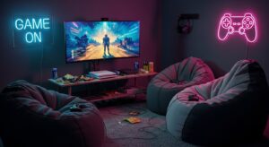Mix fun and relaxation by creating a mini gaming or puzzle area. Add pink neon signs, comfy beanbags, and snacks for cozy entertainment nights.