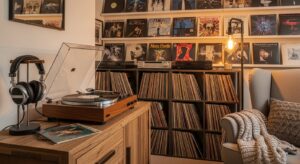If you love music, design a corner with your record player, headphones, and vinyl display shelves. Add a comfy chair and ambient lighting for immersive listening sessions.