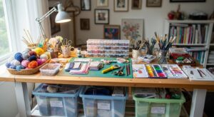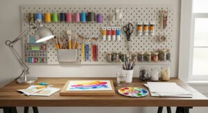 Design a small art or craft area with pegboards, organized supplies, and a sturdy worktable. Whether it’s painting, journaling, or DIY decor, this is your zone for creative freedom.