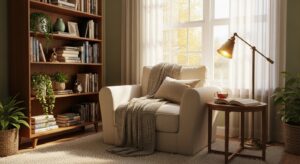 Transform a quiet corner into a reading haven with plush armchairs, soft throws, and floating bookshelves. Add a floor lamp and a side table for tea — perfect for peaceful mornings or evening escapes.
