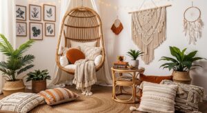 Create a laid-back vibe with woven rugs, floor pillows, macramé wall hangings, and soft fairy lights. A boho corner exudes comfort and creativity.