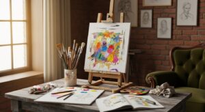 Set up an easel, paints, and inspiration boards. Add natural light or soft lamps — perfect for sketching, painting, or other creative hobbies.