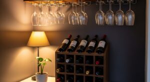 Create a chic spot with a mini wine rack, cozy seating, and mood lighting. Add elegant glassware and rustic décor for a sophisticated retreat.